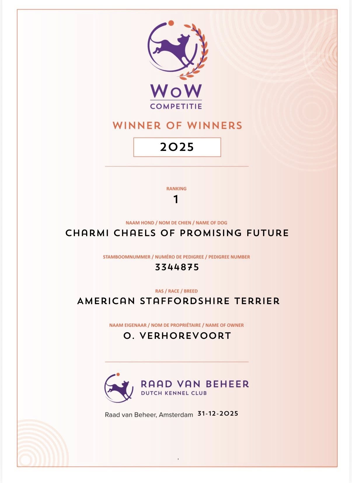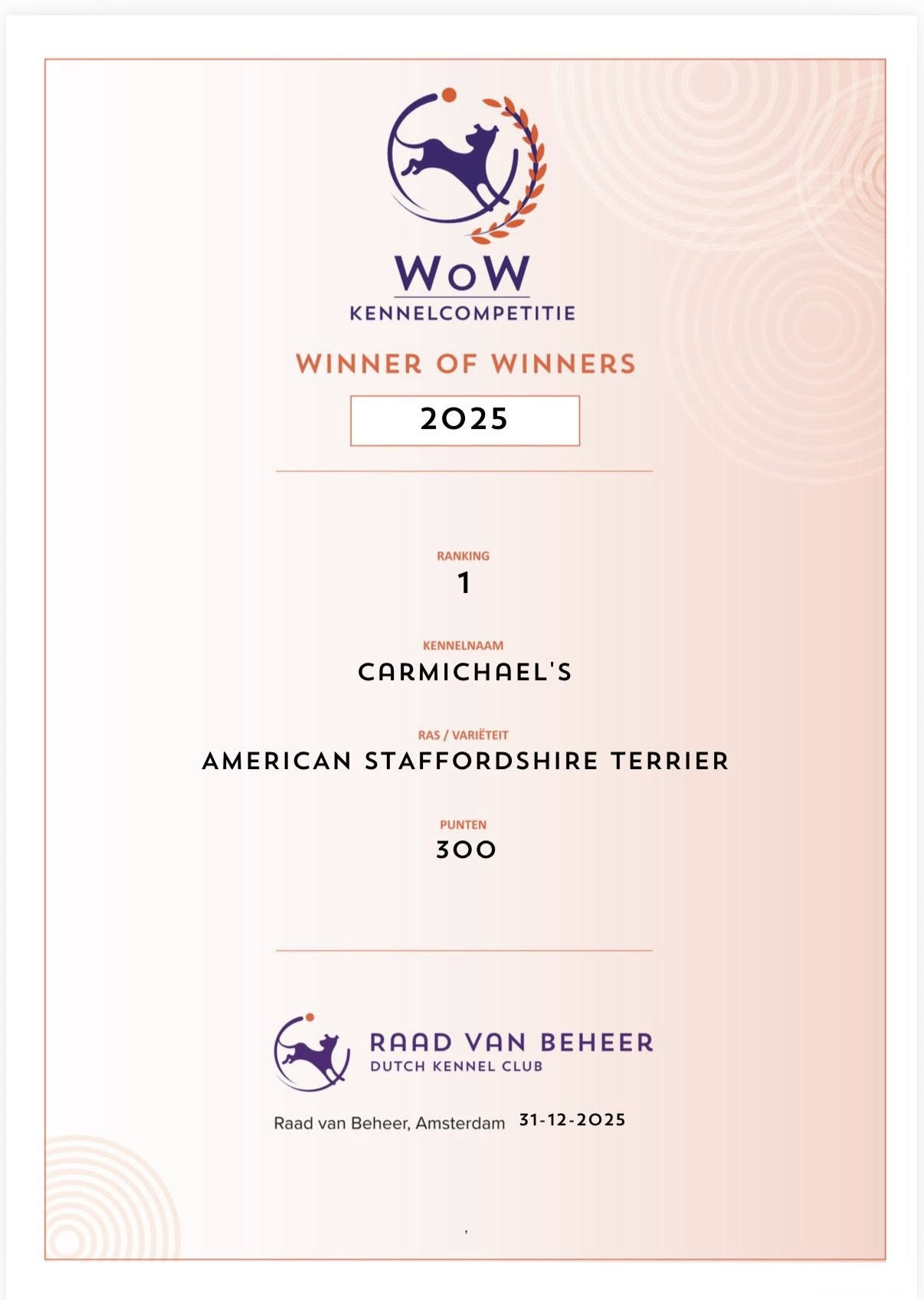 For the Fourth year in the row we won the WOW Competition for Best Kennel and Best Amstaf in the Netherlands !